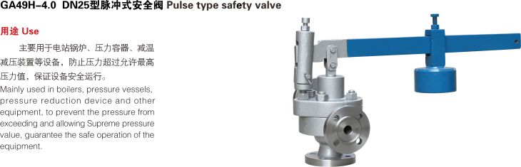 GA49H-4.0 DN25脈沖式安全閥主要用于電站鍋爐、壓力容器、減溫減壓裝置設備,防止壓力超過允許z高壓力值,保證設備安全運行